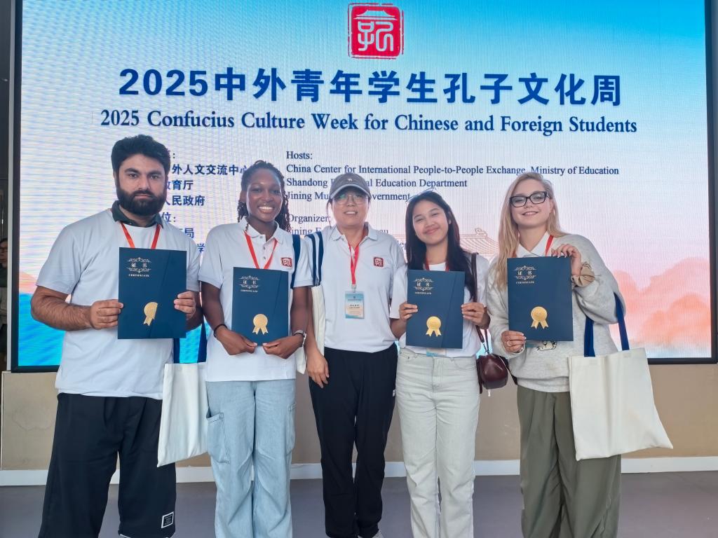 9月22日至26日,国际交流学院师生5人赴济宁参加2025中外青年学生孔子文化周活动。本次活动由教育部中外人文交流中心、山东省教育厅、济宁市人民政府主办,济宁市教育局、山东理工职业学院承办,来自23所高校的40位带队老师以及来自49个国家的134名中外青年学生齐聚文化圣城——山东济宁,走近圣人孔子,一起聆听“美美与共,和合共生”的文明交响。