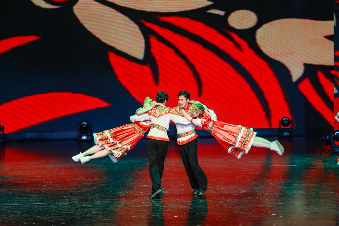 舞蹈《丝路霓裳》获得本次比赛二等奖。来自俄罗斯、摩洛哥、蒙古、哈萨克斯坦、越南、孟加拉国、斯里兰卡、印度尼西亚等国家的25名国际学生,将中国古典舞的典雅与俄罗斯舞蹈的灵动巧妙融合。节目以异域风情——交流碰撞——共生共舞 为叙事脉络,用足尖舞姿演绎“一带一路”的合作故事,生动展现了中国与周边国家睦邻友好、携手共进的深厚情谊,完美诠释了“各美其美,美人之美,美美与共,天下大同”的文明互鉴理念。